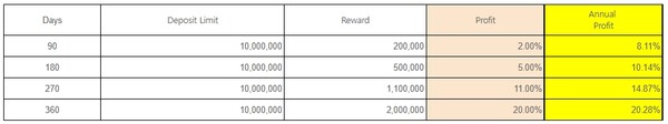 각 스테이킹 한도는 각각 1000만 위믹스로 만기 지급 리워드는 각각 20만(90일), 50만(180일), 110만(270일), 200만(360일) 위믹스다.