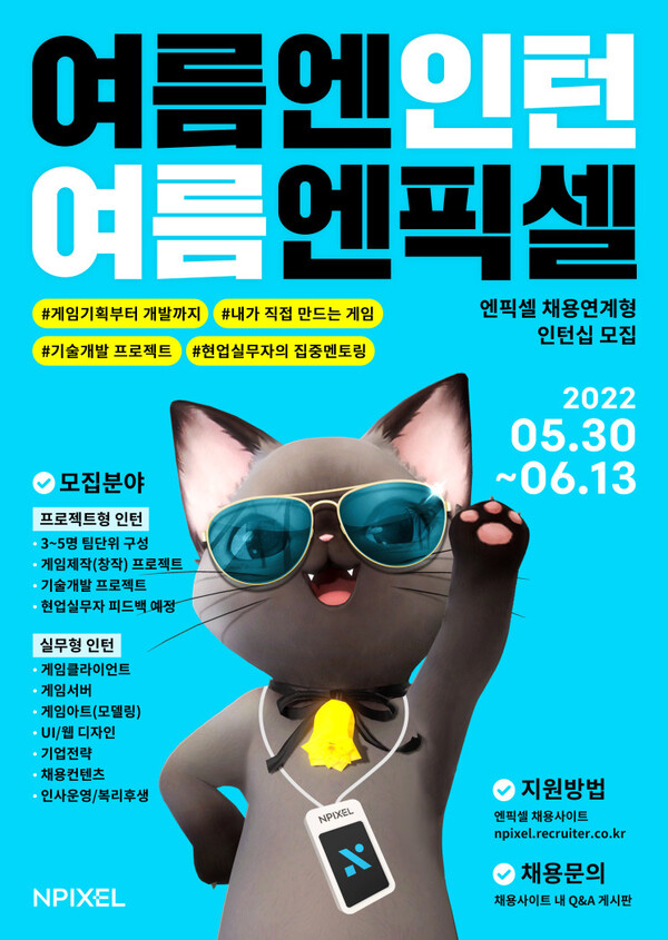 엔픽셀(공동대표 배봉건, 정현호)은 채용연계형 인턴십 프로그램 ‘여름엔인턴, 여름엔픽셀’ 지원자를 모집한다고 30일 밝혔다.