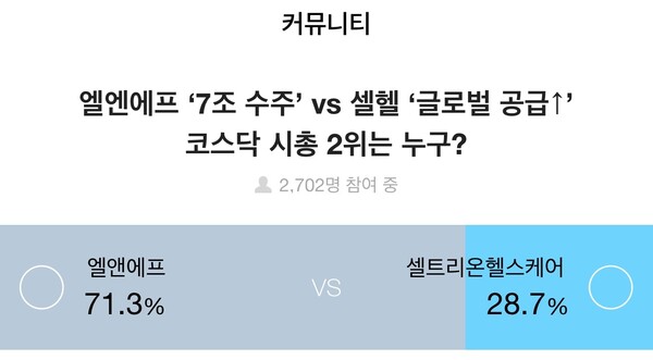 2,702명이 참여한 “엘앤에프 ‘7조 수주’ vs 셀헬 ‘글로벌 공급↑’...코스닥 시총 2위는 누구?” 설문에서 71.3%는 ‘엘앤에프’, 28.7%는 ‘셀트리온헬스케어’를 선택했다.