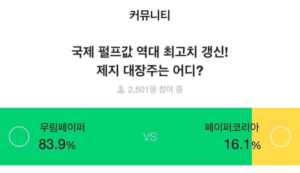 2,501명이 참여한 “국제 펄프값 역대 최고치 경신! 제지 대장주는 어디?” 설문에서 83.9%는 ‘무림페이퍼’, 16.1%는 ‘페이퍼코리아’라고 응답했다.