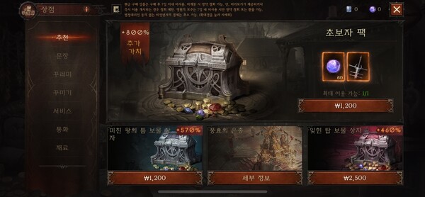 디아블로 이모탈의 상점은 추천, 문장, 꾸러미, 꾸미기, 서비스, 통화, 재료 카테고리로 구성되어 있다. 추천 상품은 말 그대로 금액 대비 효율이 높은 상품을 소개하는 공간이다. 각 상품에는 %로 공식 효율이 표기되어 있으므로 본인에게 필요한 재료가 있는 상품이라면 구매하는 것이 좋다.