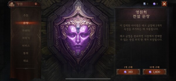 전설 문장은 1개에 대략 3,000원, 10개에 약 31,000원이 필요하다. 구매에 필요한 현금 재화인 '영원의 보주'는 160개 단위로 판매하지 않기 때문에 5,900원(315개)짜리 상품을 구매하고 전설 문장을 1개 구매하면 애매하게 155개가 남는 상황이 발생하기 때문에 되도록 31,000원(1,650개) 상품으로 구매하는 것이 좋다.