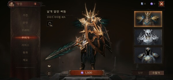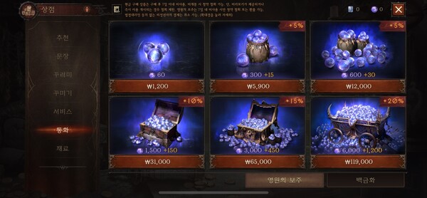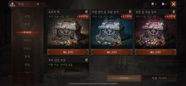 꾸러미는 앞서 언급한 추천 카테고리에 있는 상품이다. 가격이 저렴한 편이고 '미친 왕의 틈 보물 상자'와 '잊힌 탑 보물 상자' 등에는 전설 문장이 담겨있기 때문에 소과금 유저에게 적극 추천하는 상품이다.