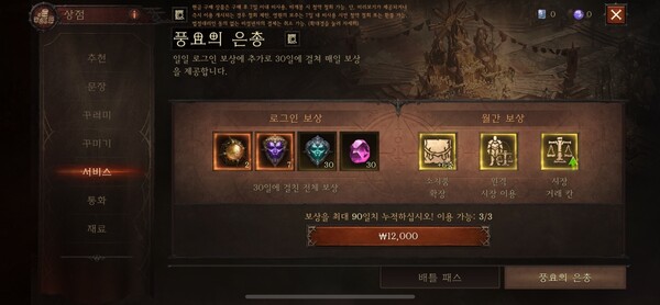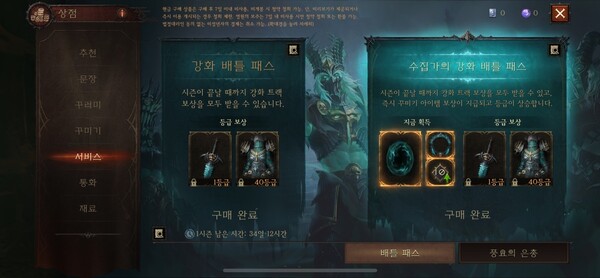 서비스는 배틀 패스 상품을 말한다. 배틀 패스는 여러 콘텐츠를 수행해서 배틀 패스 포인트를 획득하면 보상으로 경험치와 특정 아이템을 얻게 되는 방식으로 기자를 포함해 대부분의 디아블로 이모탈 경험자가 추천하는 상품이다.