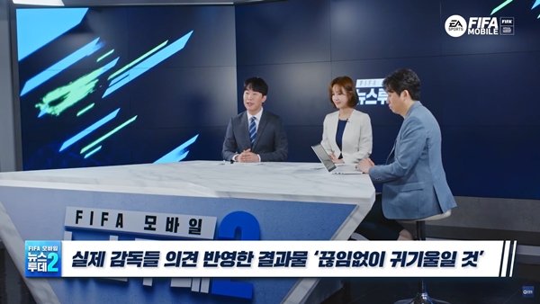 쇼케이스는 성승헌 게임 캐스터와 김수민 앵커 그리고 박수용 피파 모바일 사업팀장이 함께했다.