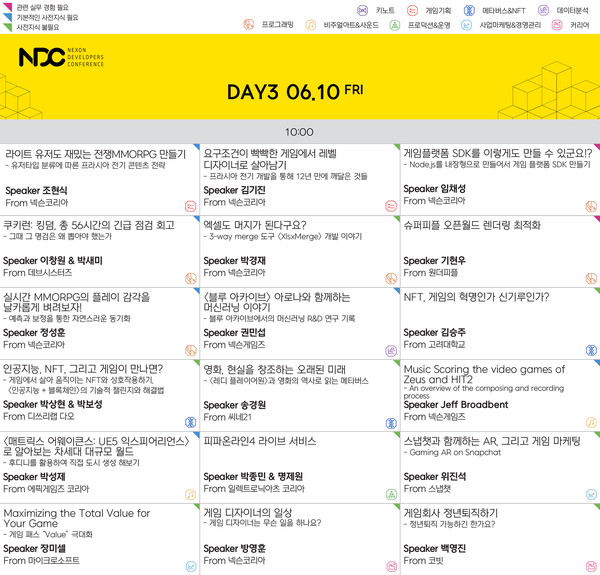 이 밖에도 '라이트 유저도 재밌는 전쟁 MMORPG 만들기', '요구조건이 빡빡한 게임에서 레벨 디자이너로 살아남기', '실시간 MMORPG의 플레이 감각을 날카롭게 벼려보자' 등의 강연을 통해 치열하게 고민하며 얻은 인사이트를 공유한다.