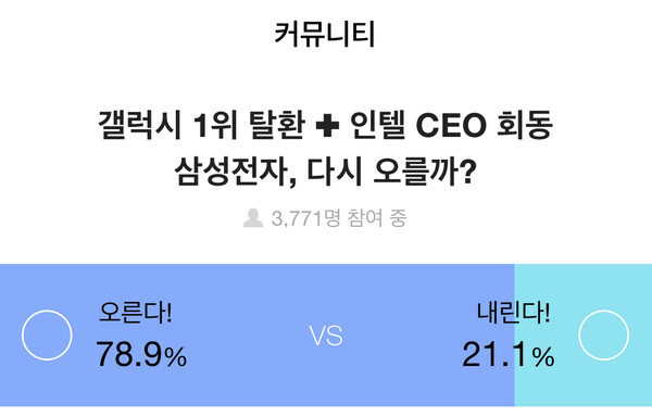 3,771명이 참여한 “갤럭시 1위 탈환+인텔 CEO 회동... 삼성전자, 다시 오를까?” 설문에서 투자자 78.9%는 ‘오른다’, 21.1%는 ‘내린다’라고 답했다.