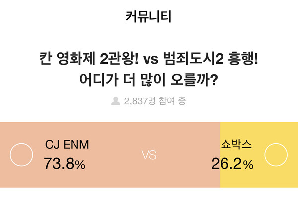 2,837명이 참여한 “칸 영화제 2관왕! vs 범죄도시2 흥행! 어디가 더 많이 오를까?” 설문에서 73.8%는 ‘CJ ENM’, 26.2%는 ‘쇼박스’를 선택했다.