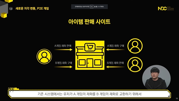그는 "블록체인과 게임의 결합이라고 하면 대부분 P2E 게임을 떠올릴 것이다"며 "P2E 게임의 조건은 게임 재화를 토큰 형태로 유저에게 지급하는 것과 게임 아이템을 토큰 형태로 지급하는 특징을 가지고 있어야 한다"고 확실하게 짚어줬다.