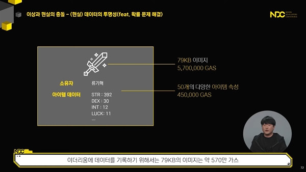'게임 아이템의 공유 시 소유권 문제', '데이터 투명성에 따른 해석 차이', '자유로운 거래를 이용하기 위해 숙지해야 할 방대한 개념', '탈중앙화 자율 조직 형성 불가' 등 블록체인 자체 문제에 대해서도 거론했다.
