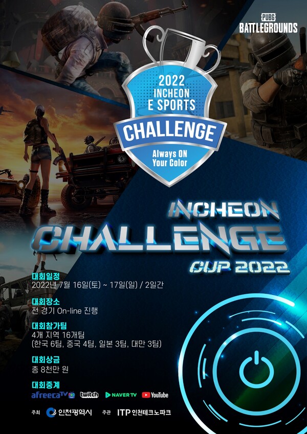 2022 인천 챌린지컵은 한국을 포함한 중국, 일본, 대만 등 각 지역을 대표하는 배틀그라운드 16개 프로팀이 참가한다. 한국의 광동 프릭스, 다나와 e스포츠 등 배틀그라운드 프로팀들이 출전해 16, 17일 양일간 온라인으로 겨룬다.