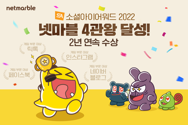 넷마블(대표 권영식, 도기욱)은 한국인터넷전문가협회가 주관하는 '소셜아이어워드 2022'에서 2년 연속 4관왕을 차지했다고 14일 밝혔다.
