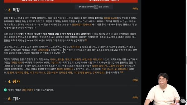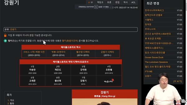 강 디렉터는 간단한 소개 이후 나무위키 검색에 자신의 이름 '강원기'를 검색했다. 검색하자 1대 이승찬 디렉터부터 7대 강원기 디렉터까지 역대 메이플스토리 디렉터들의 명단이 나열된 것을 볼 수 있었다.