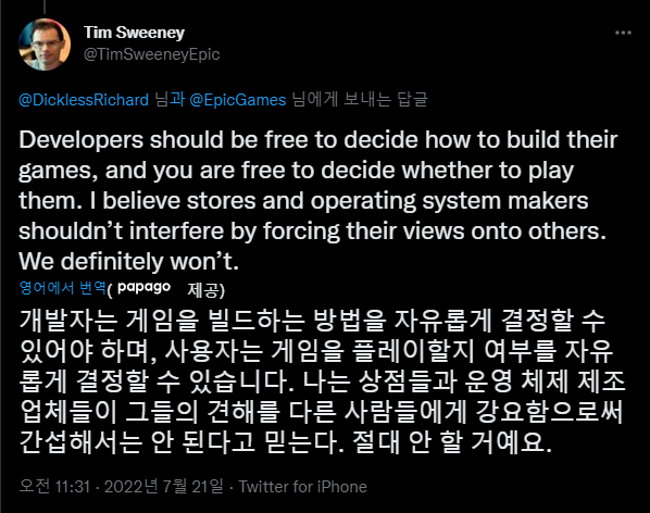 이에 팀 스위니는 "개발자는 게임 빌드 방식을 자유롭게 결정할 수 있어야 하고, 사용자는 게임을 할지말지 결정할 수 있다"며 "각 스토어와 운영 체재 개발사들의 견해를 타인에게 강요하거나 간섭하면 안된다. NFT 게임을 규제하지 않을 것"이라고 답변했다.