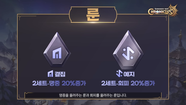 룬의 경우 '서머너즈워: 천공의 아레나' 시절부터 이어져온 서머너즈워 고유 시스템이다. 총 10개의 세트 효과가 있고, 소환수의 특성에 따라 적절하게 장착하여 사용할 수 있다. 룬을 통한 스탯 효과는 크로니클이 실시간 전투라는 점을 감안해 변경했다. 가령 기존에는 회피를 높이면 상대의 평타를 피하는 확률이 증가했다. 반면, 크로니클은 회피가 높으면 자동으로 적의 스킬 범위에서 더 빠르게 이탈하는 식으로 구현했다.