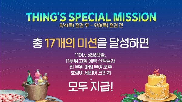 세 번째 선물 상자는 강 디렉터가 열었다. 그 안에는 17개의 미션을 성공하면 110레벨 성장 캡슐, 11부위 고정 에픽 선택 상자, 전 부위 마법 부여 보주, 호랑이 세리아 크리쳐를 모두 지급한다고 적혀 있었다.