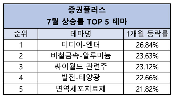 두나무(대표 이석우)는 증권 애플리케이션 증권플러스에서 7월 한 달간 ‘미디어-엔터’와 ‘에스티큐브’가 각각 상승률 1위 테마와 종목에 올랐다고 5일 발표했다.