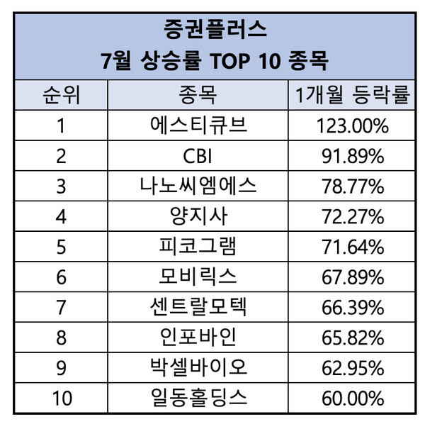 7월 한 달간 가장 많이 오른 종목은 123% 강세를 보인 ‘에스티큐브’다. 신약 개발 사업 부문에서 면역관문억제제 ‘hSTC810’이 글로벌 임상 진행 중이며, 지난 1월 미국 식품의약국(FDA) 임상 1상 시험계획(IND) 승인을 받은 바 있다.