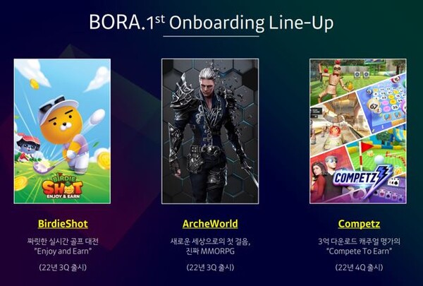 ‘크로스체인’ 환경 구축 발표와 함께 카카오게임즈 조계현 대표가 메타보라의 ‘버디샷’, 엑스엘게임즈의 ‘아키월드’, 라이징윙스의 ‘컴피츠’ 등 올 하반기 선보일 BORA의 온보딩 타이틀 라인업을 공개했다.