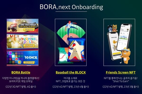 보라네트워크는 이날, 22년 하반기에 선보일 라인업 콘텐츠 외에 캐주얼 대전 ‘보라 배틀’(가칭), 스포츠 시뮬레이션 ‘베이스볼 더 블록’(가칭), 스크린골프를 활용한 ‘프렌즈 스크린 NFT’ (가칭) 프로젝트 등 새로운 차기작들도 공개했다.