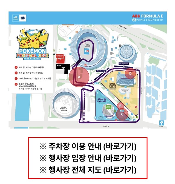 위 사진은 포켓몬페스티벌 공식 홈페이지 위치 안내 아웃링크 이미지다. E-prix 행사 안내도인 만큼 E-prix 행사장 입구까지만 되어 있다.