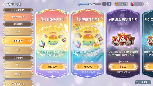 - 5성 진화 패키지 I(5만9000원) 계정 당 월간 구매 2회