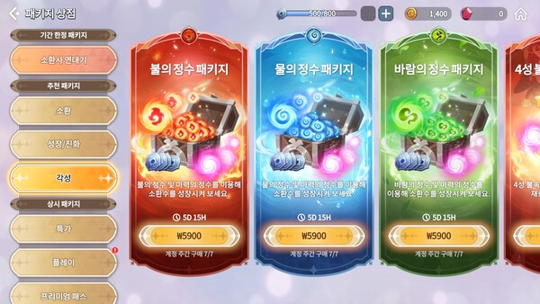 각성 섹션은 각 속성 정수, 마력의 정수, 크리스탈, 계정 배지가 표함된 정수 패키지로 구성되어 있다. 해당 패키지 아이템들은 카이로스에서 얻을 수 있으므로 캐릭터 성장 시간을 단축시킬 의도가 없는 유저들은 굳이 구매하지 않아도 무관하다.