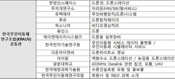 한국무인이동체연구조합 공동관은 이사장社인 한컴인스페이스를 포함한 13개 회원사가 참여, 드론스테이션, 무인이동체 서비스 데이터 플랫폼, 수중건설로봇 등 육·해·공을 아우르는 전시품을 전시한다.