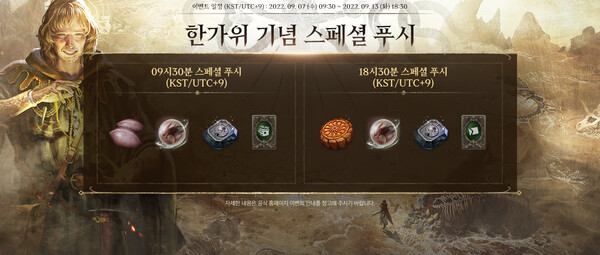 먼저 한가위 스페셜 푸시 이벤트로 유저들은 7일 오전 9시 30분부터 13일 오후 6시 30분까지 하루 두 번 한국과 대만의 명절 음식 꿀 송편과 월병을 포함해 한가위를 기념하는 푸시 보상을 획득할 수 있다.