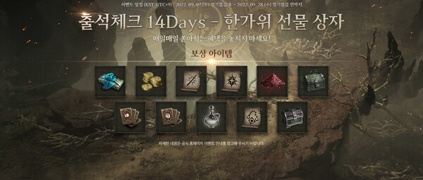 엔씨는 "힘을 잃는 시간 충전석(이벤트)은 제작을 통해 다양한 던전 충전석을 획득할 수 있는 만큼 이벤트 기간 내에 적절하게 사용하길 바란다"고 조언했다. 추가로 유저들은 일일 푸시 보상뿐만 14일 간의 출석체크 한가위 선물 상자 이벤트로 아니라 푸짐한 출석체크 보상을 받을 수 있다.