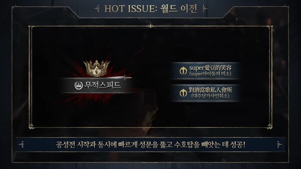 마프르 01서버에는 월드 이전으로 찾아온 대만 세력과 한국 '무적스피드' 세력의 공성전이 펼쳐졌다. 무적스피드 혈맹은 오랜 기간 마프르 01서버에 패권을 쥐고 있는 혈맹이다. 기존과 비슷한 구도로 흘러갈 거로 생각한 것일까? 대만 'Super아이돌의 미소'와 '대주당가사인회소' 혈맹은 무적스피드의 허점을 발견한 후 공성전 시작과 동시에 빠르게 성문을 뚫고 수호탑을 빼앗는 데 성공했다. 무적스피드도 거세게 반항했지만 이미 뒤집어진 상황을 역전하긴 어려웠고 무적스피드 혈맹의 왕조는 그대로 막을 내렸다.