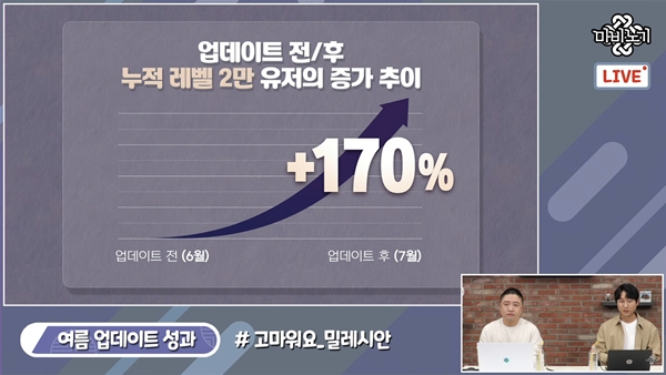 길드 가입자는 8배나 상승했고 블로니의 성장지원 4권 클리어 수는 0.2%에서 21.6%으로 약 140배 증가했다. 시청자들이 보면서 "자랑하는거야?"라고 묻자 민 디렉터는 "자랑보다는 감사의 마음이 더 크다. 함께 자랑스럽게 생각했으면 좋겠다"며 공감대를 형성했다.