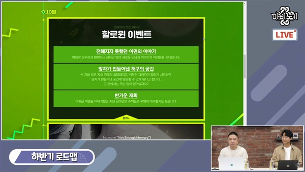 이후 업데이트 플랜에 대해 소개했다. 채팅창에서 수많은 유저들이 요청했던 한복의 경우 이번 추석에선 만나볼 수 없다. 민 디렉터는 "아무래도 상반기에는 개발팀이 모든 것을 쏟아부으며 여름 업데이트를 론칭한 바람에 한복을 준비하지 못했다. 다음 번에는 꼭 만나볼 수 있도록 노력하겠다"고 약속했다.
