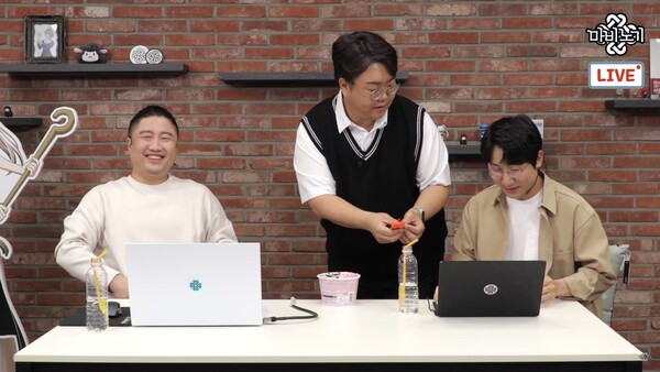 그리고 강원기 메이플스토리 디렉터가 깜짝 등장했다. 까르보나라 불닭볶음면을 들고 온 그의 모습을 보자 채팅창은 "와!", "원기 형님 환영해요", "불닭볶음면 가져오는거 되게 웃기네" 등 환호성으로 가득 채워졌다.