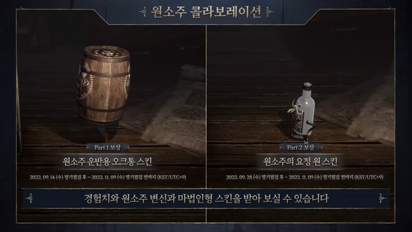 추가로 9월 14일부터 11월 9일까지 게임 내에서 뽑기를 진행할 때 바닥 부분이 원소주 브랜드의 이미지로 변경된다. 또한 연합 및 혈맹 문장으로 원소주 모양을 사용할 수 있는데, 단 연합 및 혈맹 문장이 3단계 이상일 때만 선택 가능하다.