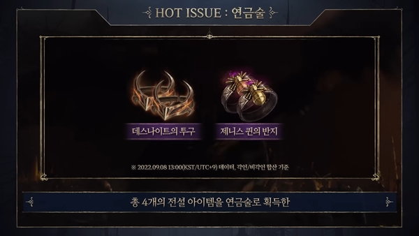 데스나이트의 투구 2개, 제니스 퀸의 반지 2개로 가장 많은 전설 등급 아이템을 획득한 유저는 조우 06서버의 '턴셔틀v' 유저였다. 이와 함께 연금술로 획득한 아이템 중 가장 많은 비중을 차지한 TOP3는 '제니스 퀸의 반지', '데스나이트의 갑옷', '공허의 활'이었다.