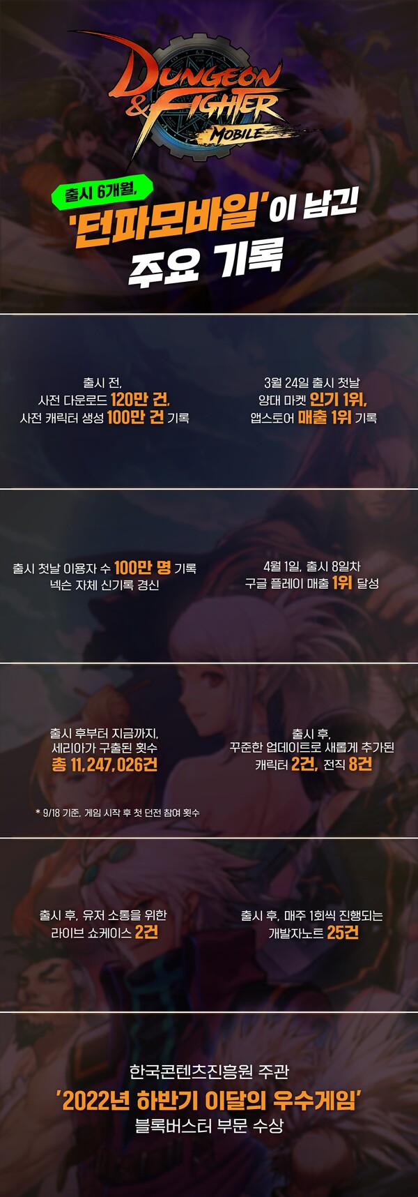 1년이 채 안 된 던파모바일의 굵직한 성과는 넥슨의 모바일 게임 역사에도 한 획을 긋고 있다. 앞으로의 6개월은 던파모바일 오리지널 캐릭터 '워리어'를 비롯해 던파모바일만의 이야기를 새롭게 그려 나갈 계획이다.