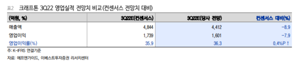 이베스트투자증권 성종화 연구원은 크래프톤의 22년 3분기 연결영업실적은 매출 4,412억원, 영업이익 1,601억원으로서 전년분기 대비 소폭부진, 전년대비 다소 부진함으로 컨센서스 대비 다소 미달할 것으로 전망했다.
