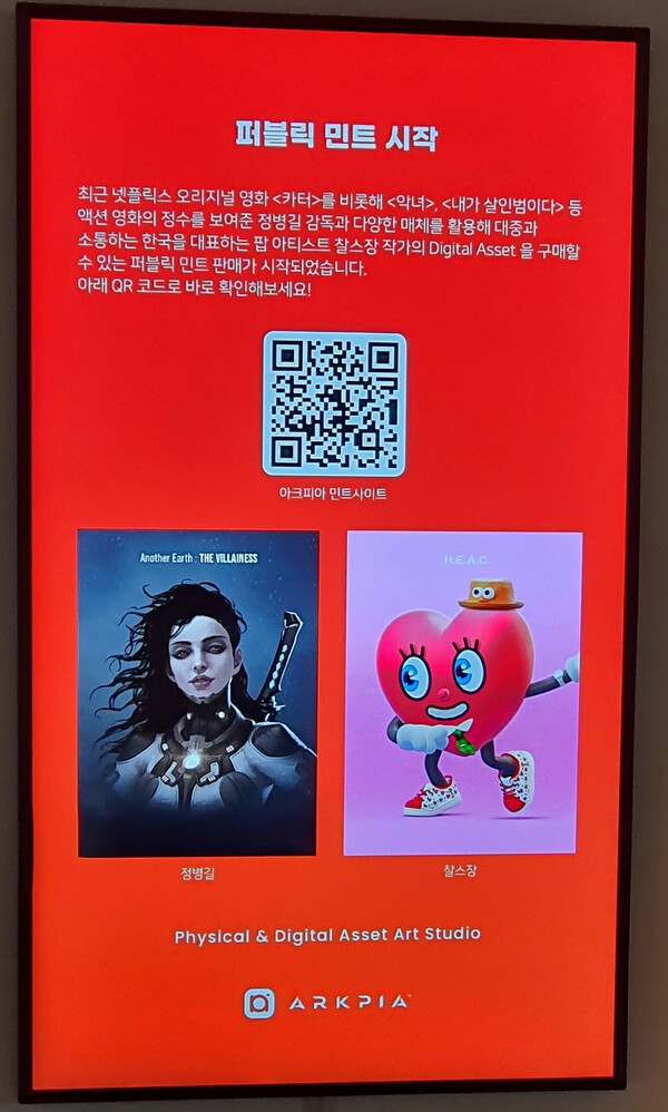 전시장 안에는 한국을 대표하는 팝 아티스트 찰스장 작가의 디지털 에셋을 구매할 수 있는 퍼블릭 민트 판매의 안내가 갤러리 한쪽 벽면에 있다. QR코드로 바로 아크피아 민트사이트로 연결되었다.
