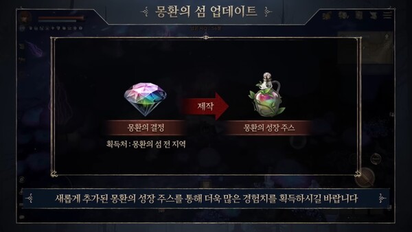 몽환의 섬에는 70레벨 지역이 추가됐다. 또한 몽환의 섬 전 지역에서 사냥을 하면 몽환의 결정을 획득할 수 있고 이를 통해 사용 즉시 경험치를 획득할 수 잇는 새롭게 추가된 몽환의 성장 주스를 제작 가능하다. 몽환의 성장 주스는 경험치 획득량을 올려주는 만큼 성장 속도를 빠르게 증징시켜줄 것이다.