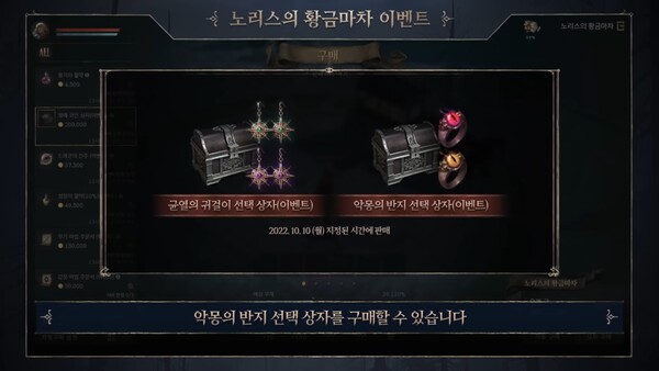 눈여겨 볼 아이템은 매일 10개씩 구매할 수 있는 '명예 코인 상자'과 10월 10일 한정 판매되는 '균열의 귀걸이 선택 상자', '악몽의 반지 선택 상자'가 있다. 관련해서 엔씨는 "10월 15일에는' 혈맹 휘장 강화 주문서', 10월 16일에는 '낡은 아덴 월드의 탈리스만 조각 상자'를 노릴 수 있으니 부디 놓치지 말고 많은 참여 부탁한다"고 전했다.