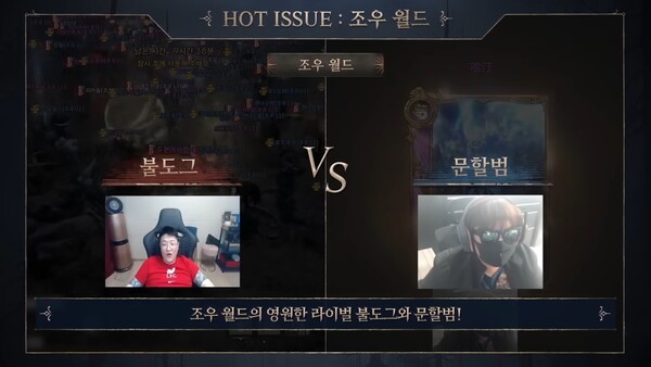 다음은 조우 월드의 영원한 라이벌 '불도그'와 '문할범'의 소식이다. 이들의 경쟁은 월드 이전 이후 규모가 더욱더 방대해지면서 다른 유저들의 시선을 주목시켰다.
