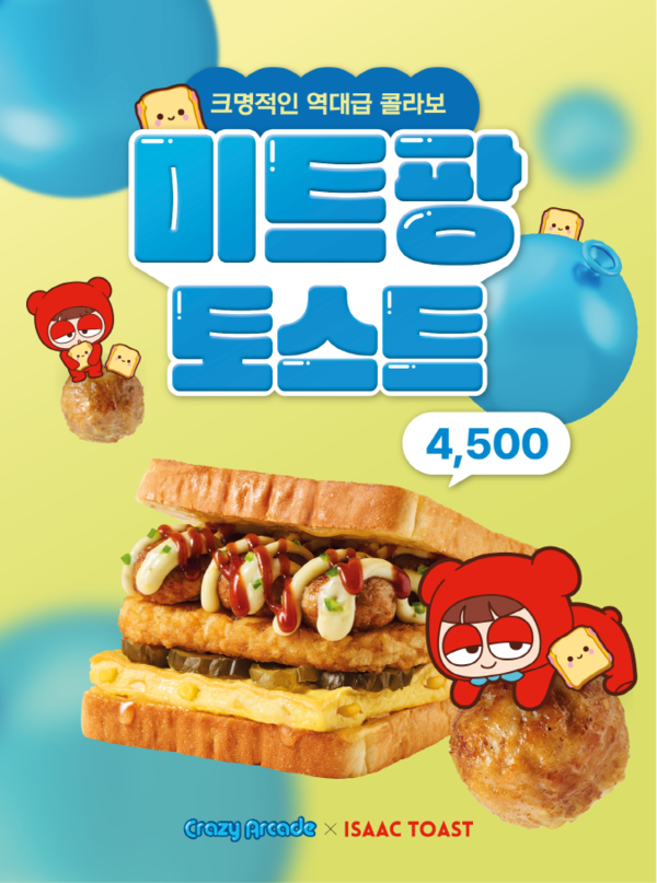 ‘크레이지 아케이드’에 ‘이삭토스트’ 매장과 모양을 구현한 맵 6종이 등장한다. 또, ‘이삭토스트’ 배경, 깃발 등 치장 아이템과 함께 ‘미트팡 물풍선’이 추가된다. ‘크레이지 아케이드’ 물풍선 아이템을 떠올리게 하는 ‘이삭토스트’ 신메뉴 ‘미트팡 토스트’가 나온다. ‘미트팡 토스트’ 구매 시 ‘미트팡 토스트 물풍선’ 쿠폰이 동봉되어 있는 ‘배찌’ 스마트톡도 함께 구입할 수 있다.
