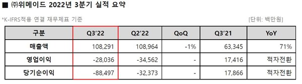위메이드(대표 장현국)는 매출 1083억 원과 영업손실은 280억 원, 당기순손실 885억 원의 2022년 3분기 실적을 26일 발표했다.