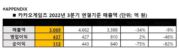모바일 게임은 전 분기와 전년 동기 대비 각각 8%와 52% 감소한 약 1970억 원의 매출을 기록했다. PC온라인 게임 역시 지난 2분기와 지난해 3분기보다 11%와 26% 줄어든 133억 원의 매출을 달성했다. 카카오 VX 등을 포함한 비게임 부문 매출은 전 분기 대비 13% 감소, 전년 동기 대비 156% 증가한 966억 원을 올렸다.