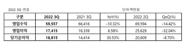 웹젠(대표 김태영)은 매출 595억 원과 영업이익 174억 원, 당기순이익 188억 원을 뼈대로 하는 2022년 3분기 실적을 발표했다.