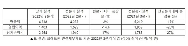 2022년 3분기 실적은 한국채택국제회계기준을 적용한 연결 재무제표 기준으로 매출액 4338억 원, 영업이익 1403억 원, 당기순이익 2264억 원을 기록했다. 크래프톤은 글로벌 경기 불확실성으로 인한 전체 시장이 감소하는 가운데, 게이머의 기대를 충족할 수 있는 플랫폼, 서비스, 지역별 맞춤형 전략을 끊임없이 전개하며 안정적인 분기 실적을 달성했다고 평가했다.