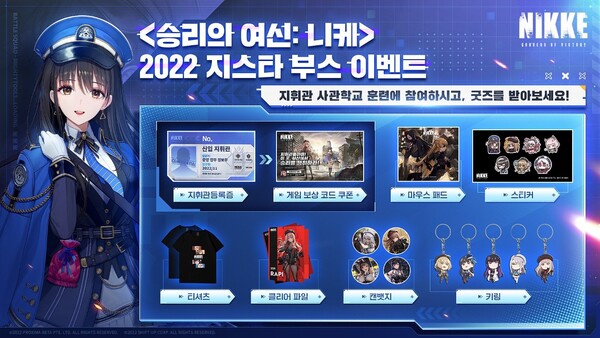 ‘승리의 여신: 니케’ 부스는 B2C관에 지휘관 사관학교 콘셉트로 꾸며질 예정이다. 부스 위치는 제2전시관 좌측 E-01에 자리 잡았으며, 관람객을 위한 게임 시연대는 물론 코스플레이어와 포토 타임을 포함한 무대 이벤트와 현장 이벤트 등 다채로운 행사가 펼쳐친다. 공식 라운지 가입, 유튜브 채널 구독, 니케 매칭 테스트, 랩쳐 사격 훈련 등 미션이 담긴 스탬프 이벤트에 참여하면 게임 재화가 담긴 쿠폰과 굿즈를 획득할 수 있는 추첨 기회를 얻는다.