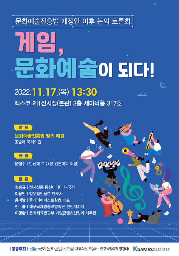 국회의원 연구단체 ‘국회 문화콘텐츠포럼(대표의원 조승래, 연구책임의원 장경태)’이 한국게임산업협회와 함께 17일 오후 1시 30분에, 부산 벡스코 제1전시장(본관) 3층 세미나룸 317호에서 ‘게임, 문화예술이 되다!’토론회를 개최한다.