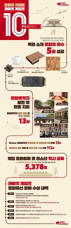 라이엇게임즈는 “게임은 문화다”라는 일념 아래 우리 문화의 뿌리인 ‘문화유산’을 보호하고 지원하는 문화재 지킴이 활동을 11년째 진행 중이다. 매해 문화재청과의 후원약정을 통해 라이엇 게임즈는 현재까지 누적 68억 이상을 문화유산 분야에 기부했다.